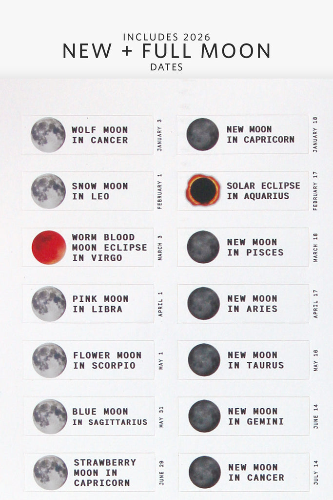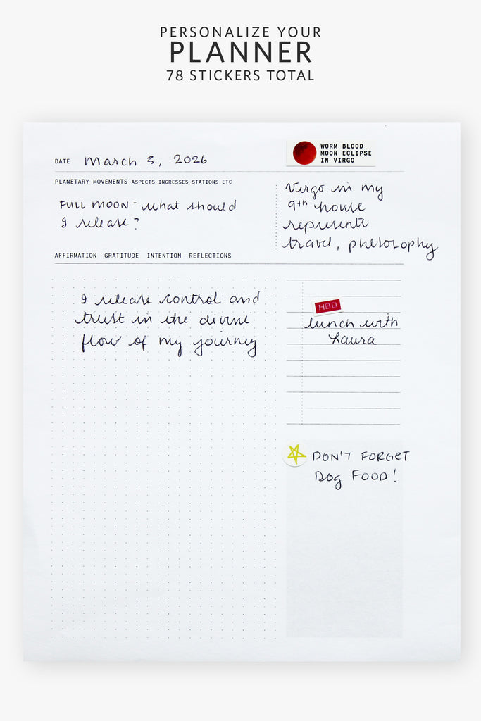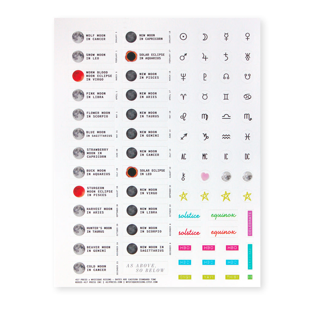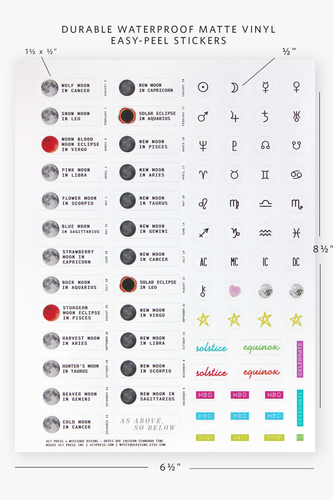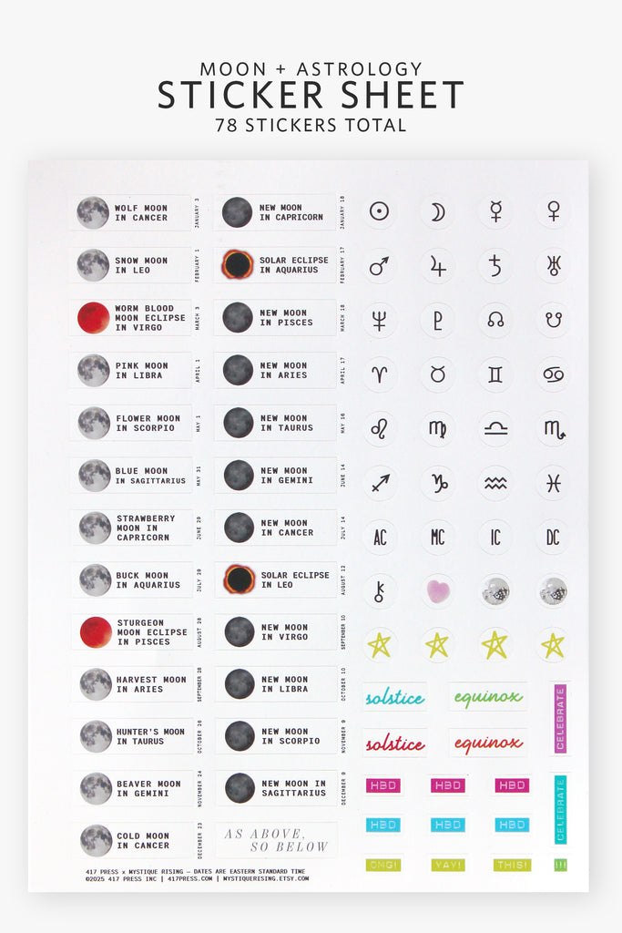 417 Press78 premium matte vinyl stickers featuring 2026 full and new moons, planets, zodiac signs, solstice, equinox and more. Easy peel, durable, water-resistant stickers are perfect for planners, worksheets, workbooks, water bottles, laptops, and more.